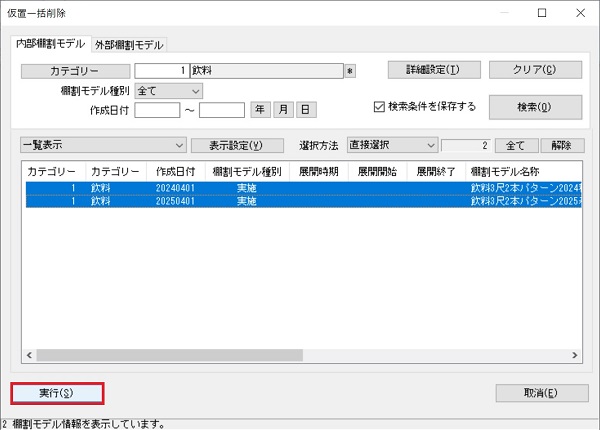 ※棚割モデルは選択したあと、再度[棚割モデル選択]より追加選択可能です。- 仮置一括削除の画面で[実行]をクリックします。